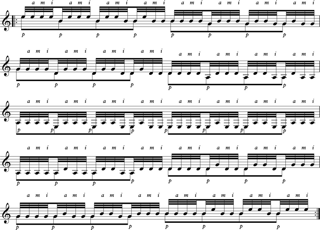 If you’ve worked through both Part 1 and Part 2 to improve your right hand confidence, you can add this exercise to the bunch. I teach this one to students who are working on developing tremolo. But, it’s very useful for mastering the subtlety of string crossing with other right-hand fingerings. Use it to develop your basic right-hand fingerings im, mi, am, ma, ia, ai in both rest and free stroke, and pi, pm, pa for free stroke. Then try the basic pattern for tremolo pami or even go nutty with ami and ima. : )