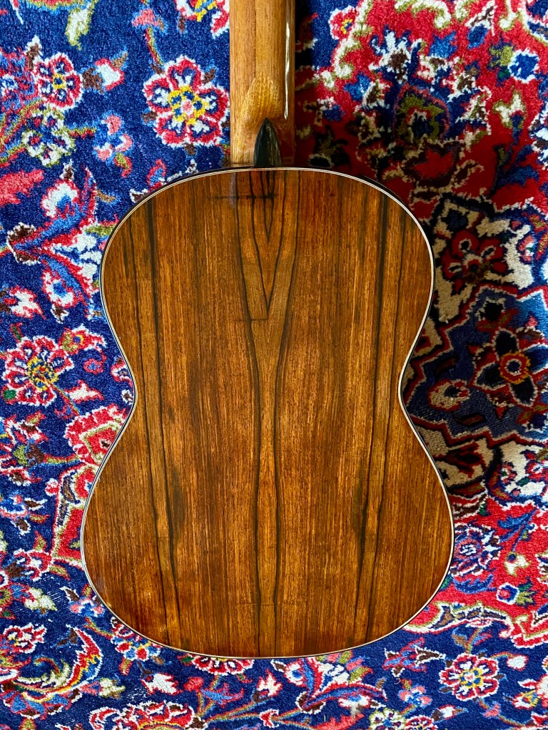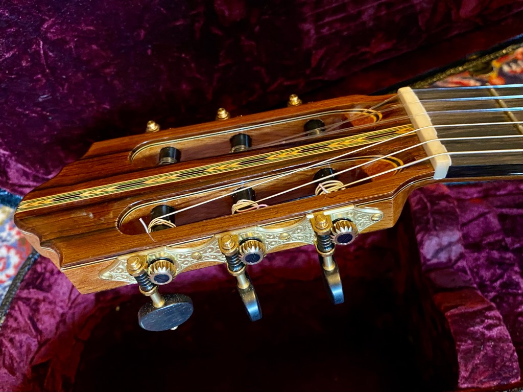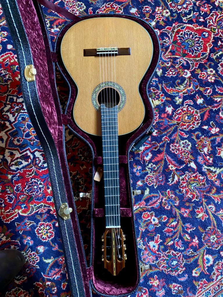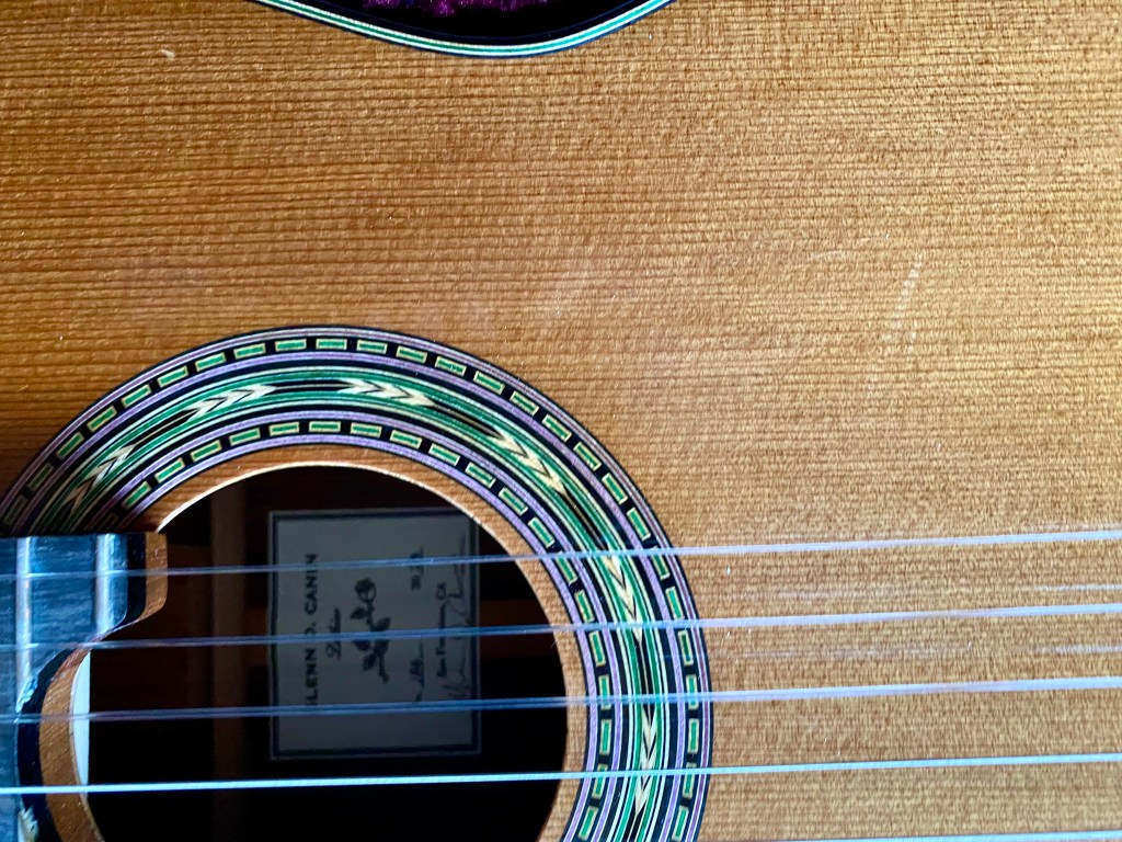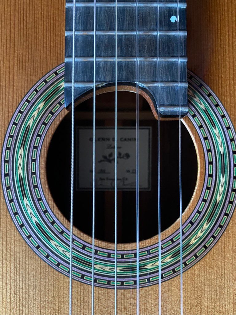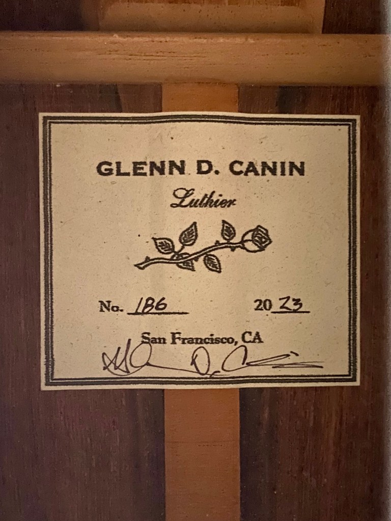 Glenn Canin built this guitar for me in December of 2023. It is a spectacular cedar/cedar doubletop with beautifully figured Madagascar rosewood back and sides in excellent condition. If you’ve played Glenn Canin’s guitars, you know that they are compellingly powerful with rich sparkling trebles and dense round basses. This guitar is no exception and represents his best work to date. Part of the appeal of Glenn’s guitars is that the tone quality has the complexity of the best traditional guitars, like Bouchet, Friederich, and Ruck, but with the power, depth, and response of a modern doubletops. Their rapid response occurs without any loss in the density of the fundamental note, making the instruments both comforting and a joy to play. This is the type of guitar that will make you sound better. It also is effortless to play: perfect action, perfect fret size, and perfectly calibrated intonation. The scale is 650 mm and 51.5 mm at the nut and comes with Kris Barnett tuners and a TKL case.