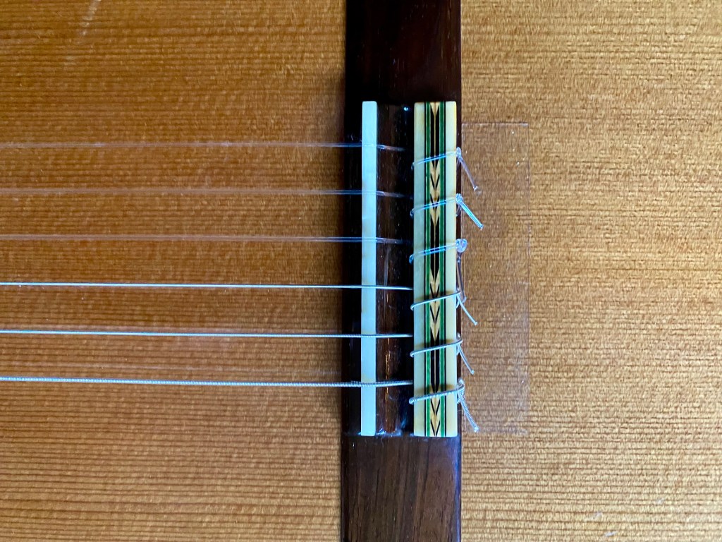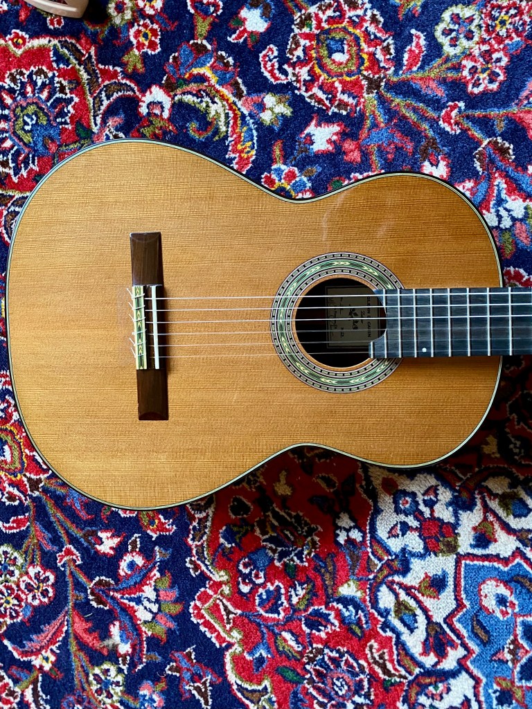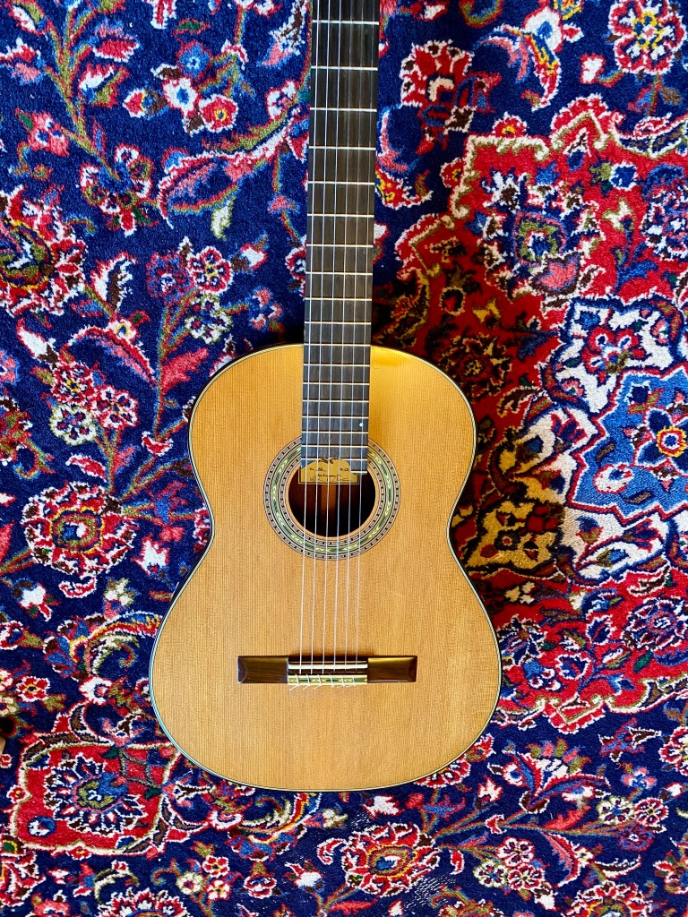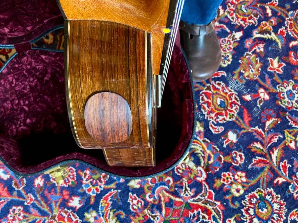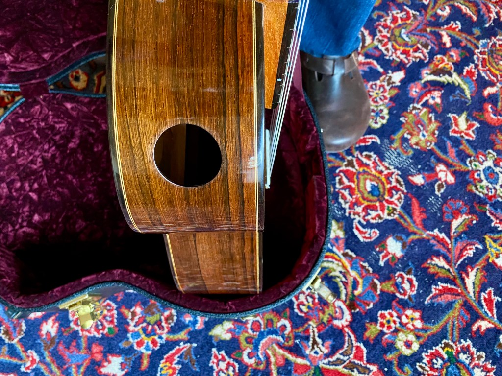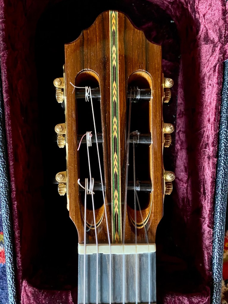 Glenn Canin built this guitar for me in December of 2023. It is a spectacular cedar/cedar doubletop with beautifully figured Madagascar rosewood back and sides in excellent condition. If you’ve played Glenn Canin’s guitars, you know that they are compellingly powerful with rich sparkling trebles and dense round basses. This guitar is no exception and represents his best work to date. Part of the appeal of Glenn’s guitars is that the tone quality has the complexity of the best traditional guitars, like Bouchet, Friederich, and Ruck, but with the power, depth, and response of a modern doubletops. Their rapid response occurs without any loss in the density of the fundamental note, making the instruments both comforting and a joy to play. This is the type of guitar that will make you sound better. It also is effortless to play: perfect action, perfect fret size, and perfectly calibrated intonation. The scale is 650 mm and 51.5 mm at the nut and comes with Kris Barnett tuners and a TKL case.